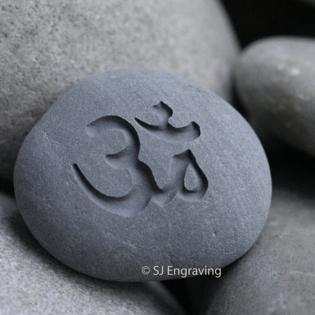 Om carved in stone. This stone size is about 2" across in darker gray. You will receive one stone similar to the photo. A gift bag is included.